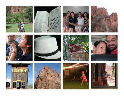 1. family photo at Zion National Park 2. keeping busy on the drive 3. sister photo minus one 4. Zion National Park 5. kissing Hammy my niece's new pet dwarf hamster 6. hat 7. directions 8. Auntie and Uncle Jake by Ted 9. Fort Zion Virgin Trading Post Village 10. one of the three patriarchs 11. lulu dancing under the twinkle lights 12. self portrait