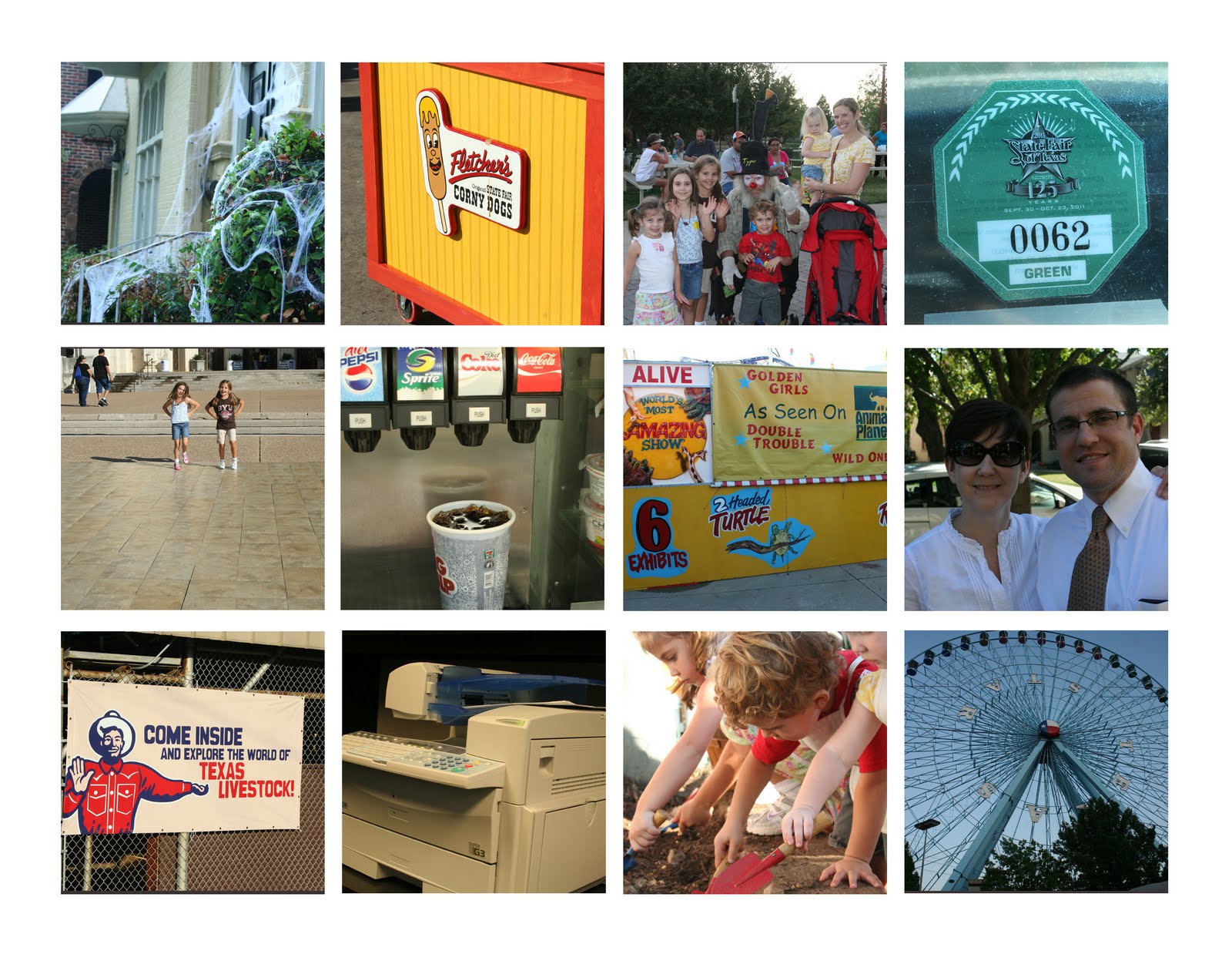 1 halloween decorations adorn our front porch. i need to pick up pumpkins, but because our doorway is full sun ALL DAY LONG they usually only last a week before turning to mush. 2 fletcher corny dogs are classic state fair food. we tried fried pickles this year. they were okay. 3 the crew with the scariest clown around. 4 some friends of ours make a sizable donate to the science museum at the fairgrounds, so when the state fair rolls around they get a parking pass that could only be described as pure gold. no parking hassles. no parking or entrance fees. parking right on the grounds. seriously, PURE GOLD. 5 lulu and her friend maren made up this funny little song and dance. they decided to perform it for us. 6 my morning jolt. 7 of course we bought tickets to see the two headed creatures. we refused to let the kids go on any rides, because that would have been a nightmare, but i think seeing the smallest turtle in the world AND a two headed snake is pretty awesome. 8 adam was post call so he came home early. he was going to go with us, but instead he was a champ, he stayed home and did a couple of the things we needed to do before leaving for boston. we took a photo, because a few weeks ago we were looking through our photo gallery and realized there are a couple of years in our marriage that we didn't take one single photo of just the two of us during the year. 9 we always venture to the livestock barns. i learned a lot about show cows and whatnot. i am slowly realizing i talk to A LOT of strangers and i am completely my father. 10 the bane of my existence. i have to fax forms throughout the day and unfortunately it isn't right next to my desk, so i spend the bulk of the day walking back and forth between my desk and this albatross. 11 the kids always love the "little hands farm" at the fair. they were in the process of digging a hole to plant their seeds. 12 love the texas state ferris wheel.although it wasn't the best idea it ended up being just what i needed. thankfully my sweet friend forgave me for being 45 minutes late. yikes! whoever said a working mom can do it all is either lying or is far better organized than i am.